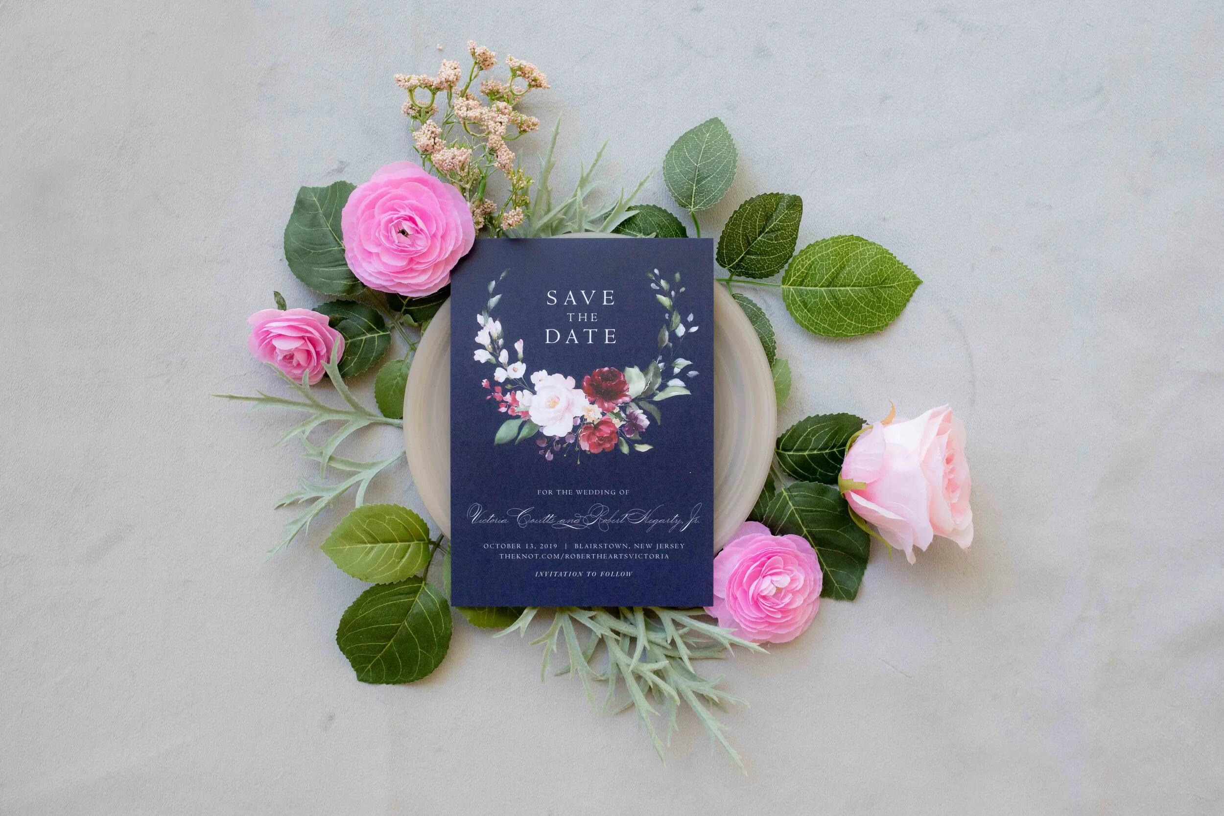 Victoria and Robert came to Honeybee Paper looking for a custom suite that reflected their deep love. This couple had been together for nearly a decade before getting engaged. Their wedding color palette of deep blue, burgundy, and blush was reflected in the suite for their fall wedding. This suite was evoked a deep romance and was perfectly moody in every way.